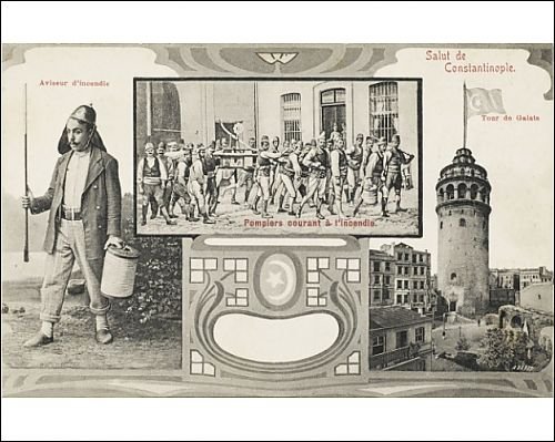 - Image Description: Turkish Firemen in Constantinople - Galata Tower with cresent moon flag flying atop. The gentleman on left is a fire lookout. The city was very prone to fires (which broke out regularly) due to wooden buildings and charcoal cooking fires, resulting in regular conflagrations.
